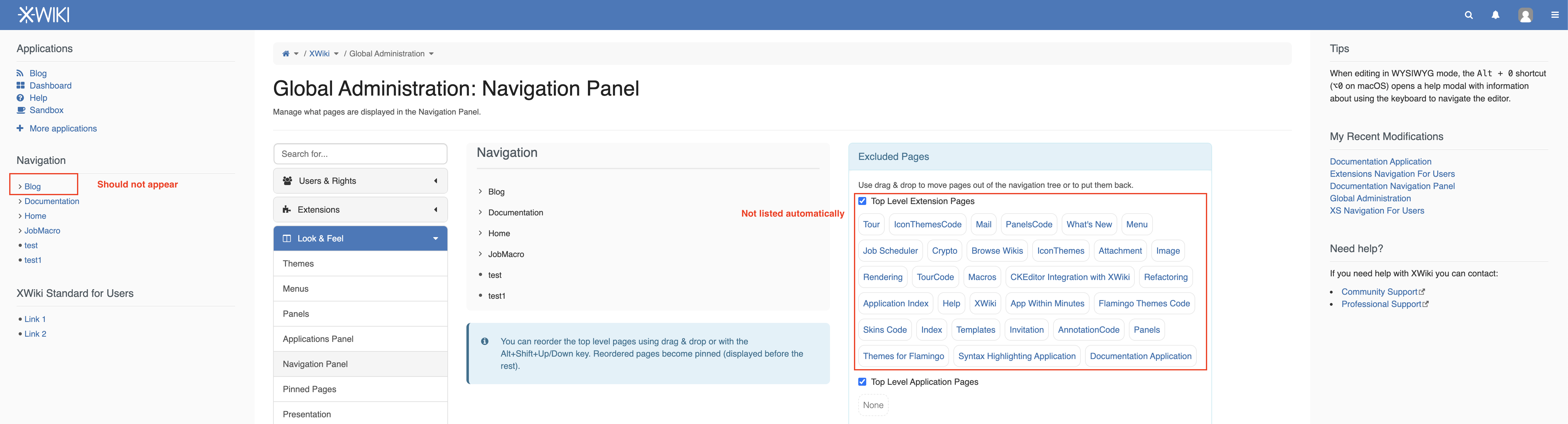 The reason it's listed is because Blog.WebHome is configured in the pom.xml as customizable and the Navigation Panel removes apps that have a top level page of a type that denies editing.