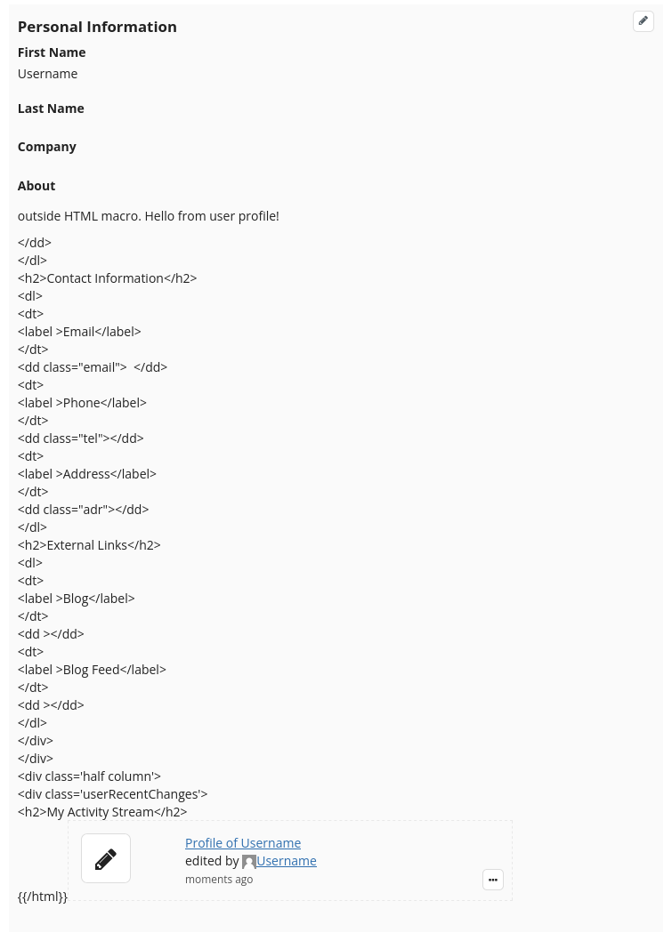 The text "outside HTML macro. Hello from user profile!" is displayed in the about section, followed by raw HTML output. A file "/tmp/hacked.txt" is created on the server that runs XWiki with "Hello from user profile!" as content. This demonstrates an escalation to programming rights and remote code execution.