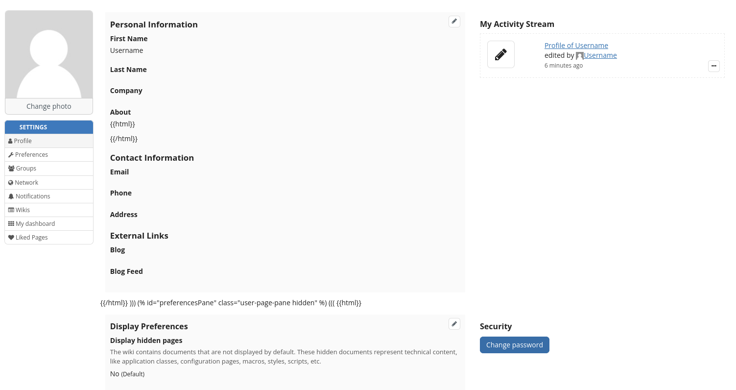 All sections of the user profile are displayed on a single page, separated by snippets of raw XWiki syntax: