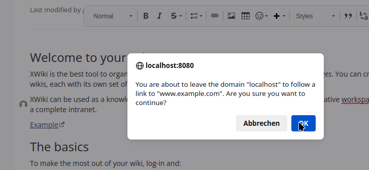 A warning is displayed even though the click wouldn't navigate away from the current page. In contrast to that, no warning is displayed when clicking on the floating button to actually follow the link.