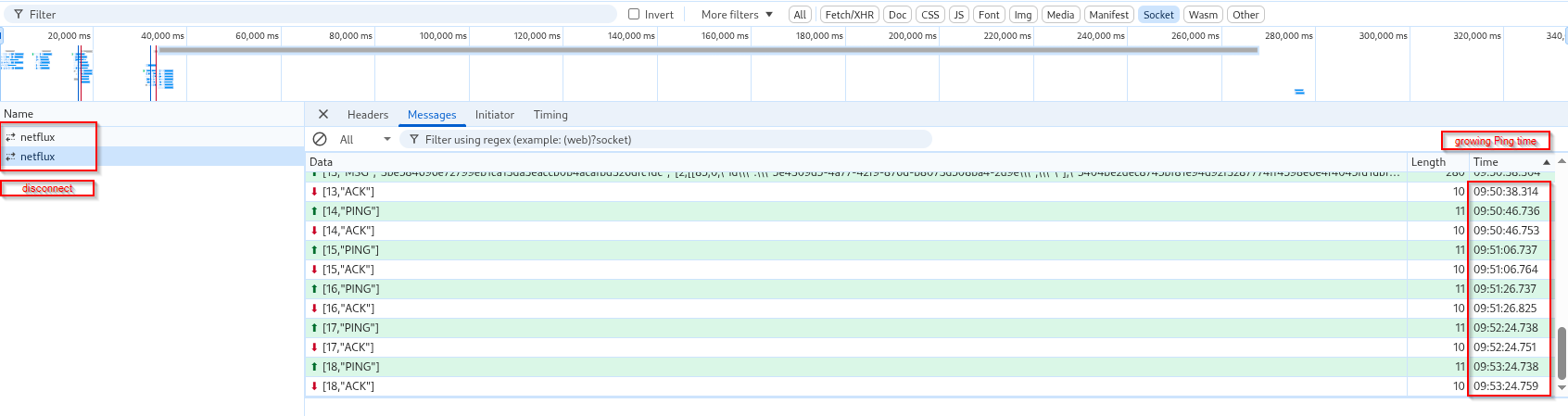 Below is a screenshot from the Chrome Developer Tools showing the WebSocket traffic. You can see the Pings occur normally at first, but once throttling kicks in, the interval stretches to ~60s, leading to the disconnect.