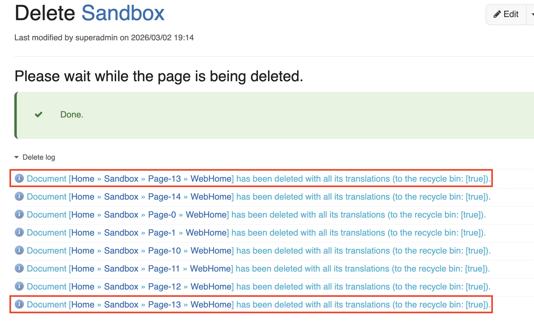 - Go to Sandbox.WebHome, choose to delete the page