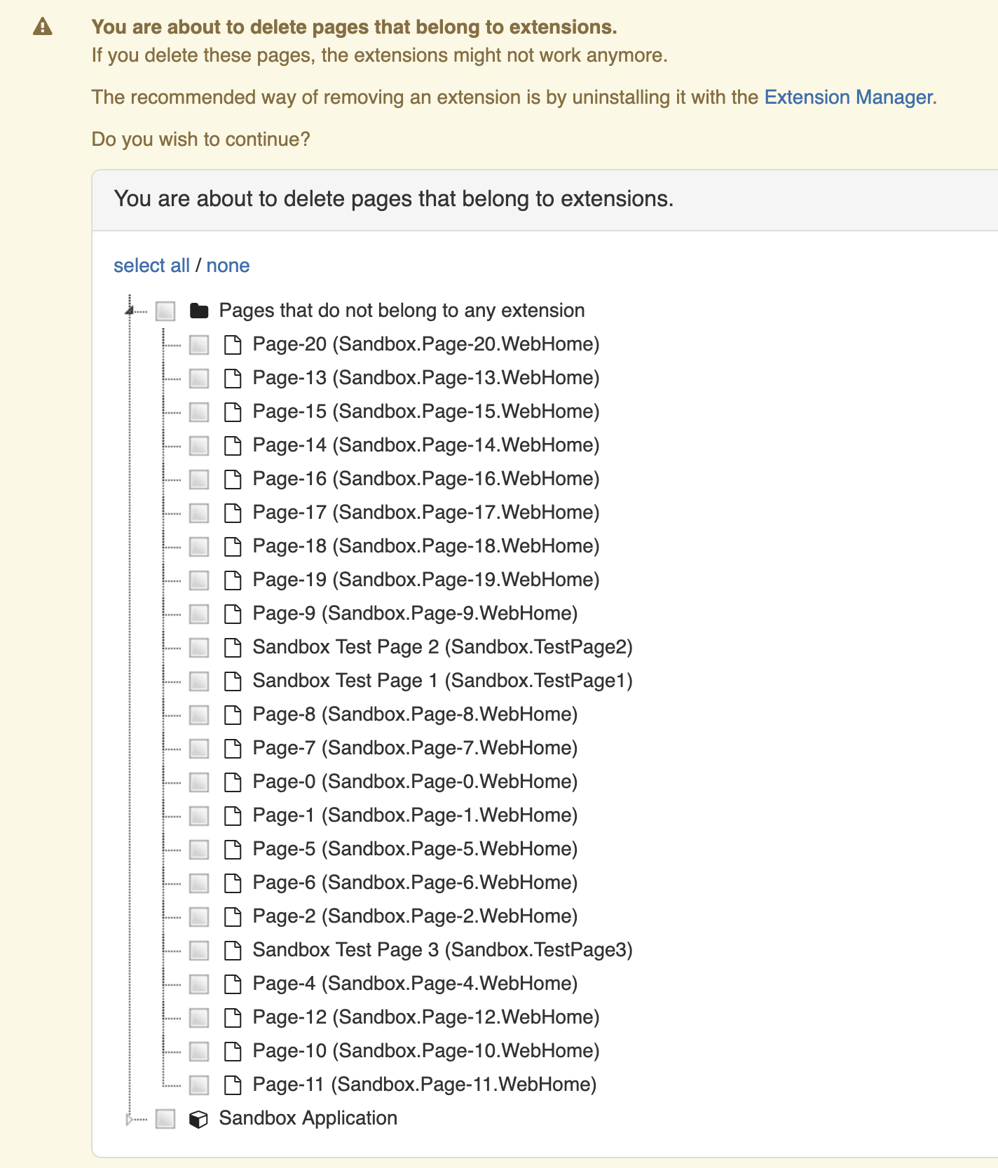 III. In the tree of "Pages that do not belong to any extension", there actually ARE pages belonging to extensions (see Sandbox.TestPage1, Sandbox.TestPage2 and Sandbox.TestPage3). The reason why they're displayed in that section is that they're set to not be permanent, users being able to delete them (see https://github.com/xwiki/xwiki-platform/blob/master/xwiki-platform-core/xwiki-platform-sandbox/pom.xml#L57-L68) . The name of this tree is therefore misleading and it should be replaced with something representing better that category of "unprotected" pages.